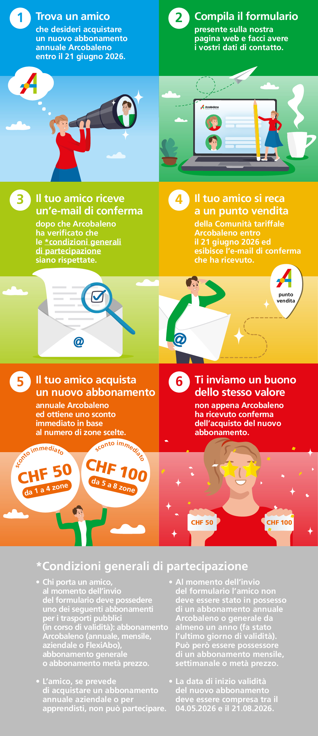 Convinci un tuo amico o una tua amica ad acquistare un nuovo abbonamento annuale Arcobaleno entro il 21.06.2026 e entrambi riceverete un buono del valore di CHF 50 o CHF 100 in base al numero di zone che acquisterà.